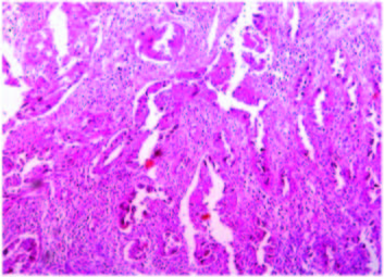 A 60-year-old postmenopausal woman with no familial cancer history presented with one episode of postmenopausal bleeding. She is multiparous woman with two male and two female offsprings. History of her sexual activity cannot be obtained. Gynecological examination revealed an exophytic mass 2cm x 3cm on posterior lip of cervix with ill-defined margins and bled on touch. Per rectal examination was normal. Punch biopsy was taken and histopathology report was adenocarcinoma. All hematological, biochemical and radiological tests were within normal limits. A clinical diagnosis of adenocarcinoma of cervix, FIGO stage IB1 was made and posted for surgery. Intra-operatively, cervix was barrel shaped and bilateral enlargement of obturator group of lymph nodes. Patient underwent radical hysterectomy III and specimen was cut opened, it showed endocervical growth of 3cmx4cm [Table/Fig-1] and sent for histopathology. Microscopic diagnosis was Clear Cell Carcinoma of cervix (CCCC) with bilateral parametrial invasion [Table/Fig-2,3]. After four weeks of surgery she received whole pelvis external beam radiation. The patient is still under observation after 6months of treatment with no signs of recurrence.