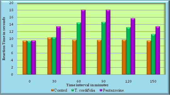 These results indicate that this commercially available extract of T. Cordifolia produced statistically significant (p<0.05) analgesia when compared with the control group in hot plate method.