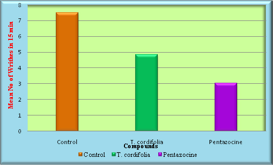 T. cordifolia contains alkaloids, glycosides, flavonoids, steroids and terpenoids in the aerial part of the plant. So, the observed analgesic activity may be attributed to any of these phytoconstituents. There are also reports of analgesic activity of flavonoid which is mediated by inhibiting the production of prostaglandins [4].