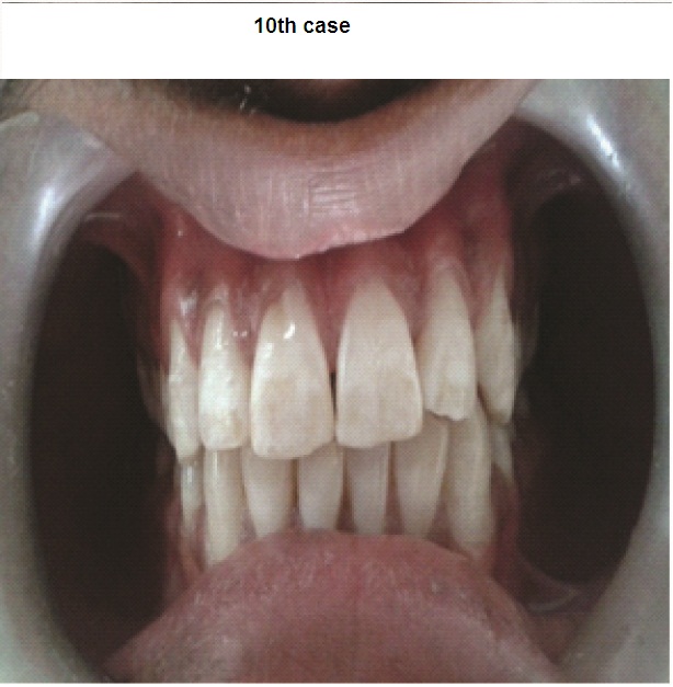 Ten patients were selected with the chief complaint of discolored upper anterior teeth. They gave history of discoloration since child hood and were drinking borewell water in their native place which is a fluoride belt area. Family members of some of the patients had similar complaint. No other relevant medical and dental history was elicited from them.