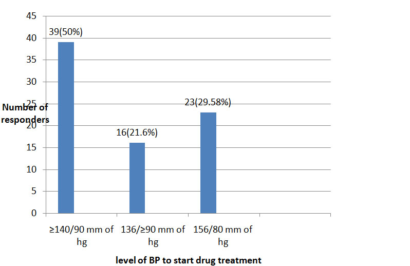 According to JNC classification, 58(74.35%) GPs know the correct definition of prehypertension. Fifty two (66.66%) GPs have considered BP of ≥140/90 mm of hg as HTN. Fifteen(19.23%)GPs diagnose BP of 136/≥90 mm of hg as isolated diastolic hypertension (IDH) and only 13 (16.6%)GPs consider isolated systolic hypertension (ISH) for BP of 156/80 mm of hg.