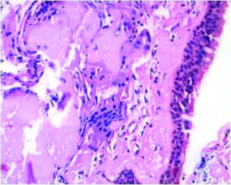 Some of these deposits formed casts surrounded by inflammatory cells and multinucleate giant cells,H&E 400x magnification