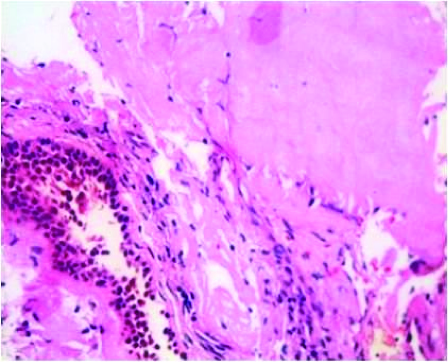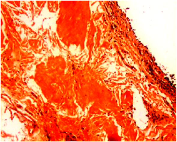 Transbronchial lung biopsy was done and showed subepithelial deposits of acellular eosinophilic homogenous material resembling amyloid [Table/Fig-9]. These deposits showed apple green birefringent under polarising microscopy using Congo red stain [Table/Fig-10]. Thioflavine T stained the deposits. On immunohistochemistry Lambda and kappa light chain antibodies were negative. In addition there were foci of calcification.