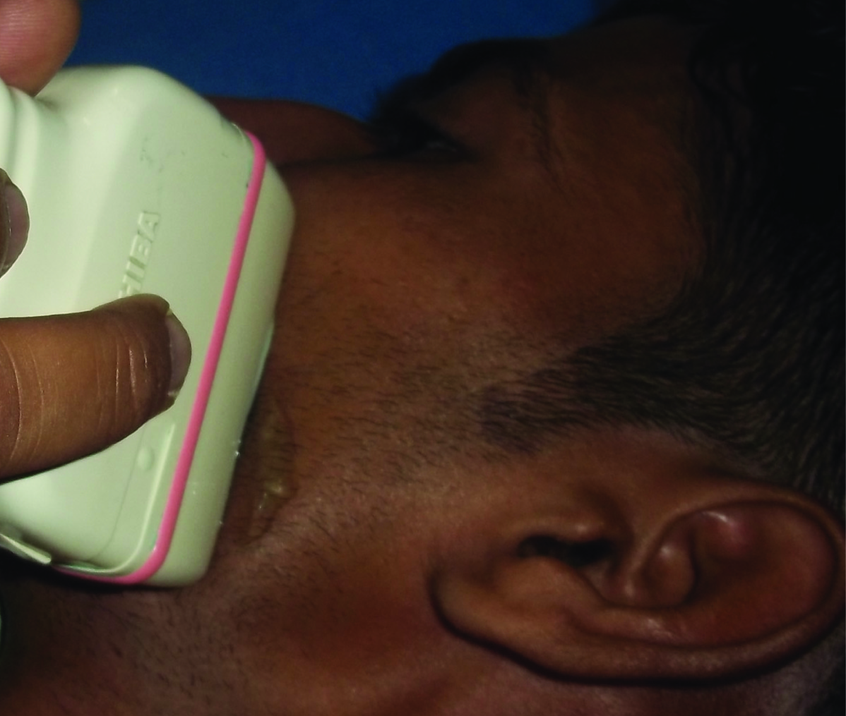 For ultrasonographic examination of MM, a water-based gel was applied to the probe before the imaging procedure [Table/Fig-2]. During imaging, the transducer was held perpendicular to the surface of the skin and special care was taken to avoid excessive pressure. The measurement site was at the thickest part of the masseter, close to the level of the occlusal plane, approximately in the middle of the mediolateral distance of the ramus (a line drawn on the skin parallel to and two centimeter above the inferior border of the mandible, approximately corresponding to the most bulky part of the superficial portion of the MM). Ultrasound examinations were performed with patient in supine position by single examiner using Toshiba power vision 6000 ultrasound imaging system with linear transducer (5-11 MHz).
