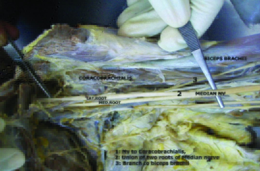 Figure illustrating the anomalous lateral cord branching on left side After branch for coracobrachialis from lateral cord (1), nerve for biceps brachii comes out from lateral root of Median nerve (3), after which both the roots of Median nerve unite (2)