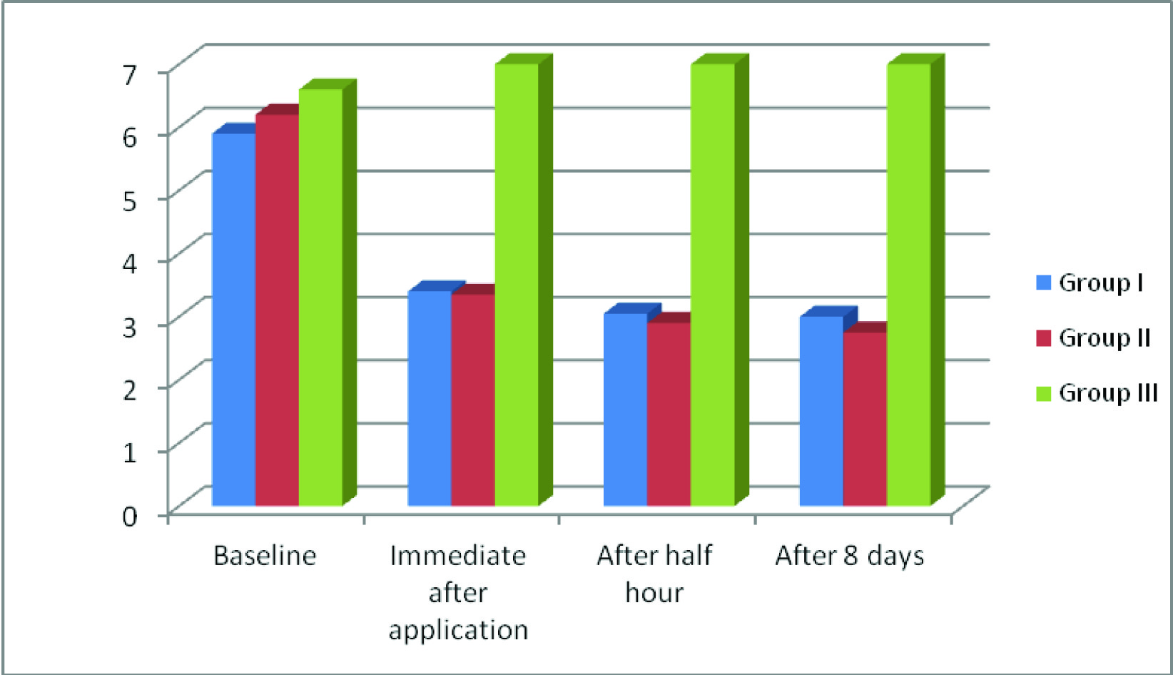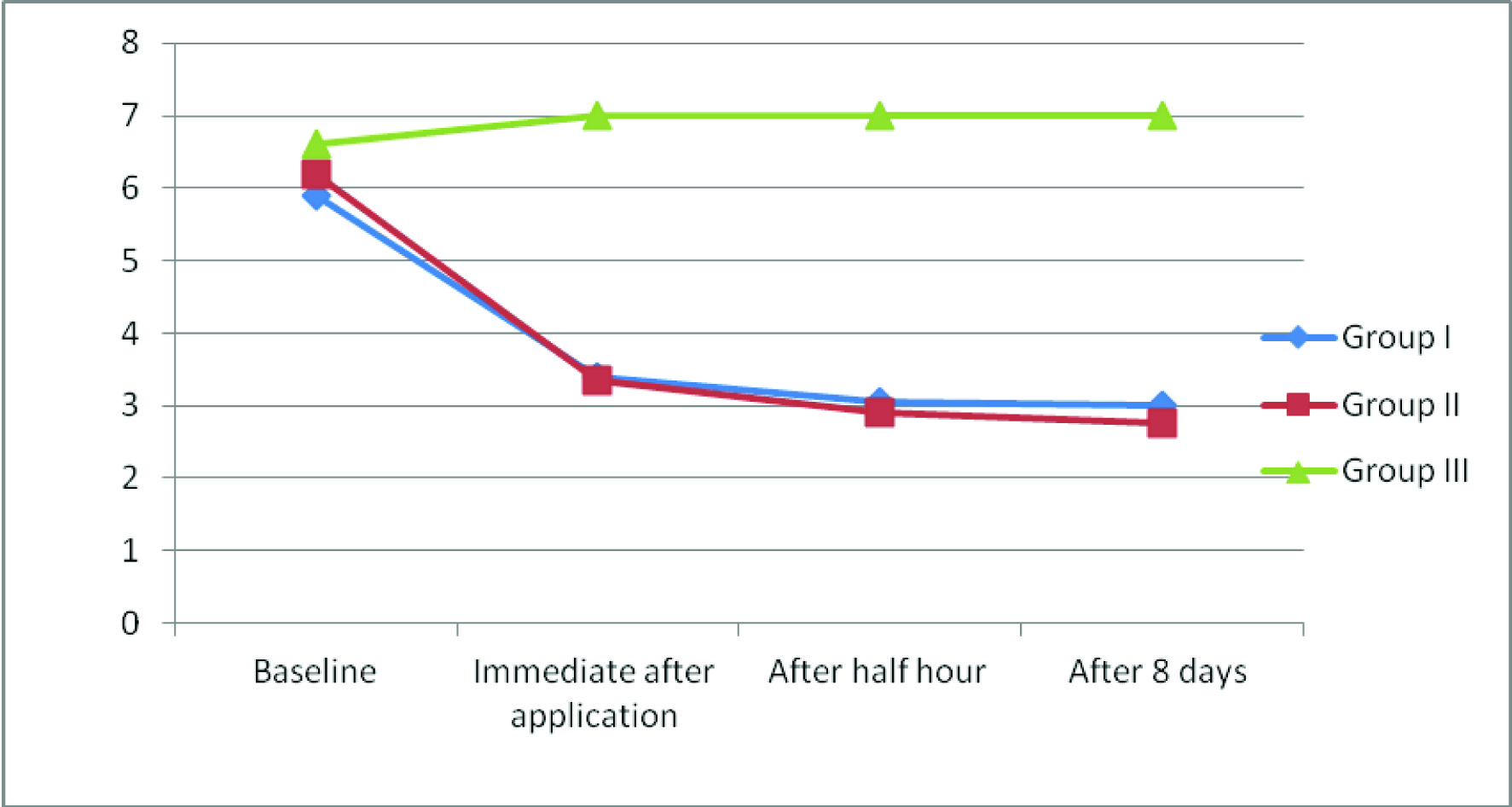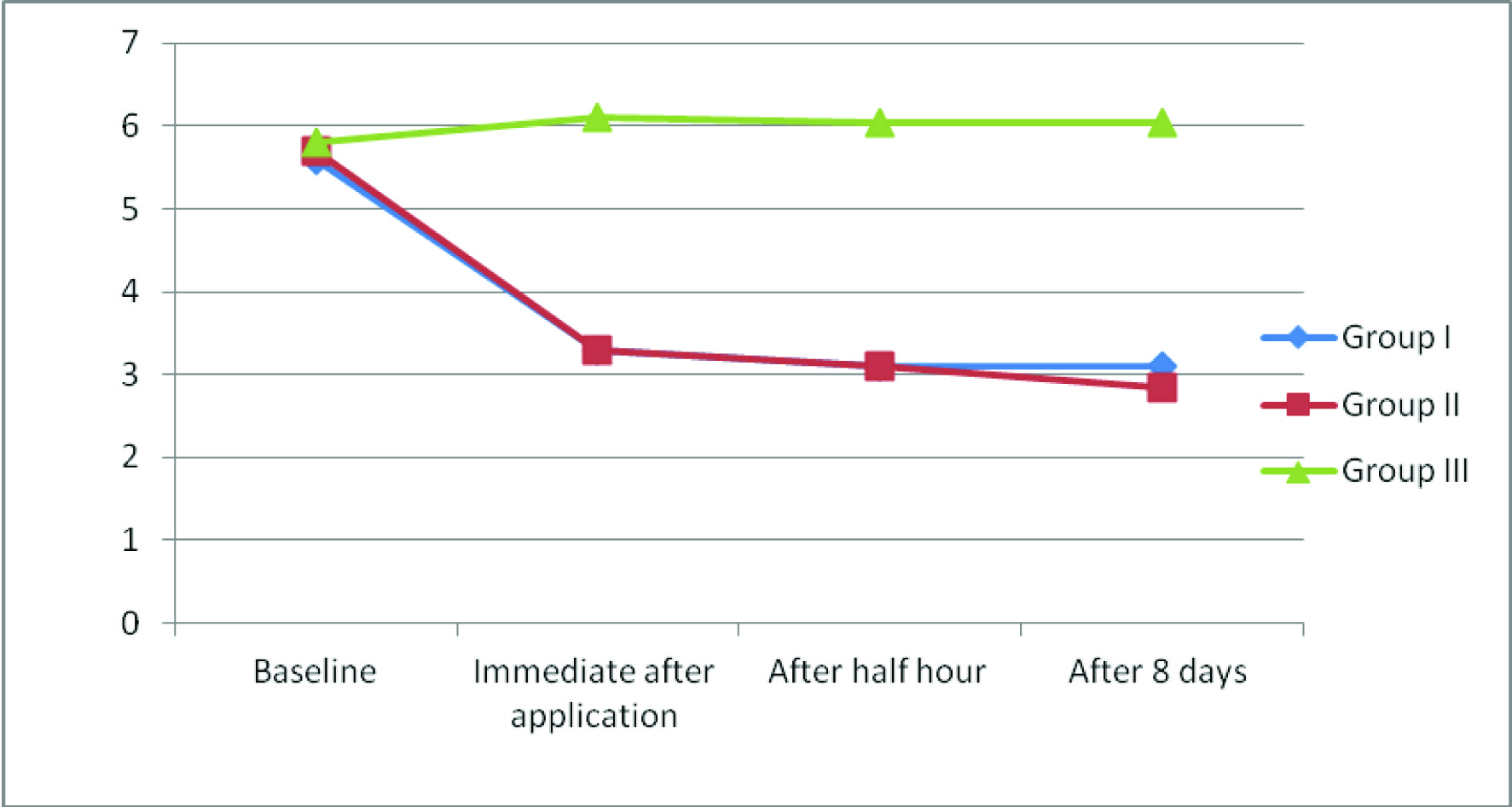 VAS scores in between group I and group III and between group II and group III were statistically significant <0.001 immediately after application, after half an hour and after 8 days [Table/Fig-4,6–8].