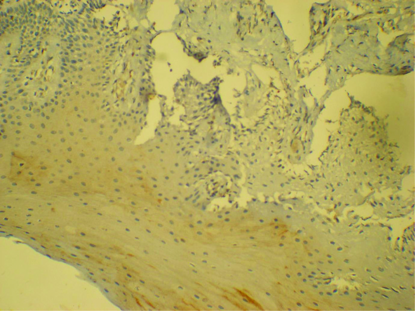 The sections were assessed for positive and negative staining. In the normal retromolar mucosa the staining was considered positive only if there was staining in the basal layer and the two layers above it, irrespective of whether the staining was obtained in the superficial layers or not.