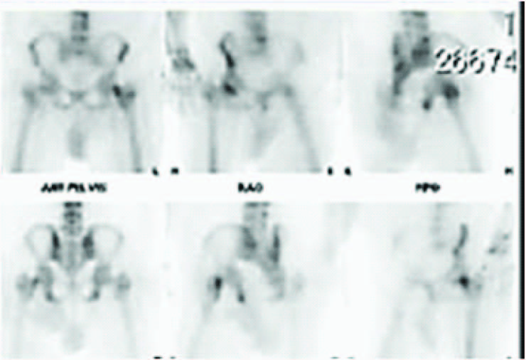 A 56-year-old man with the past medical history of chronic renal failure and long term haemodialysis since 10 year presented to the emergency room (ER) in Dr Erfan Hospital, Jeddah, Saudi Arabia with recent history of fall down in the bathroom 2 hour before. After fall, he was limping, had moderate degree pain at the left hip during rest and aggravated on walking. The general physical examination was unremarkable. However, local examination at the left hip showed mild tenderness and limited range of movement. Slight swelling on anterior and lateral aspect of left hip was also noted. The laboratory investigations showed high level of serum creatinine of 512 micromole/Litre. The Blood counts were within normal limits. An immediate portable X-ray of the pelvis including hips was obtained for the provisional clinical diagnosis of left hip neck fracture line. The X-ray pelvis and hips showed a subtle lytic area at the left femoral head / neck without obvious fracture. Further evaluation of the left hip was done with CT scan, which confirmed the X ray finding of lytic bone lesion at the left femoral head and neck, associated with cortical erosion and soft tissue involvement; however, no fracture was seen [Table/Fig-1] . The differential diagnosis based on CT scan was made including multiple metastases, geode cyst related to osteoarthritis and amyloid arthropathy. The patient was admitted for further investigations. The bone scan was done using Tc99m-MDP using triphasic protocol showed increased activity at the left femoral neck [Table/Fig-2] . As MRI is more sensitive for the diagnosis of amyloid arthropathy, further evaluation with MRI hip was done. The MRI showed the typical signal pattern of amyloid arthropathy, decreased signal on T1 weighted and T2 weighted images, due to amyloid deposition depositions at both hips, particularly at the left hip [Table/Fig-3a&b] . A lucent low signal line at the left femoral neck was consistent for the pathological fracture. The adjacent soft tissues were infiltrated with amyloid. Post-gadolinium enhanced images showed enhancement of the amyloid deposits at the bone and soft tissues. Based on typical MR findings, a diagnosis of amyloid arthropathy involving the hips was made and biopsy was advised for confirmation. CT-guided biopsy of the left hip was subsequently performed. Histology revealed irregular bands of Congo red stain–positive fibrous material, which exhibited neckpale apple green birefringence to light, confirming the diagnosis of β2 microglobulin amyloid arthropathy. Patient was treated symptomatically with Tablet Acetaminophen 500 mg, three times a day as long as compliant of pain. Additionally, curettage and bone grafting of amyloid bone defects was done in left femoral head and neck. Patient was discharged and followed for two months. Final X-rays of left hip showed no complications. Patient was also advised for the renal transplantation, an ultimate treatment to prevent further deposition of amyloid.