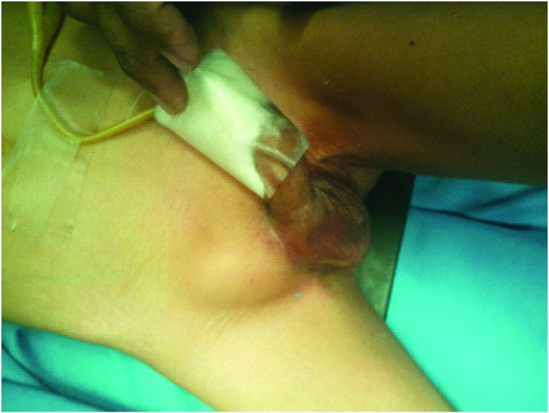 The patient was resuscitated with intravenous fluids, and broad spectrum antibiotics were initiated. Surgical exploration of right groin was performed under general anaesthesia. The mass turned out to be torsion of the right testis which was oedematous and already gangrenous [Table/Fig-2]. The testis was excised after securing the vascular pedicle. The left testis could be pulled down easily into the scrotum and through a separate incision it was anchored to the scrotal wall (orchidopexy) by two silk stiches. The patient was started on oral feeds on post-operative day one along with barbiturate. He had an uneventful recovery and was discharged on postoperative day five.