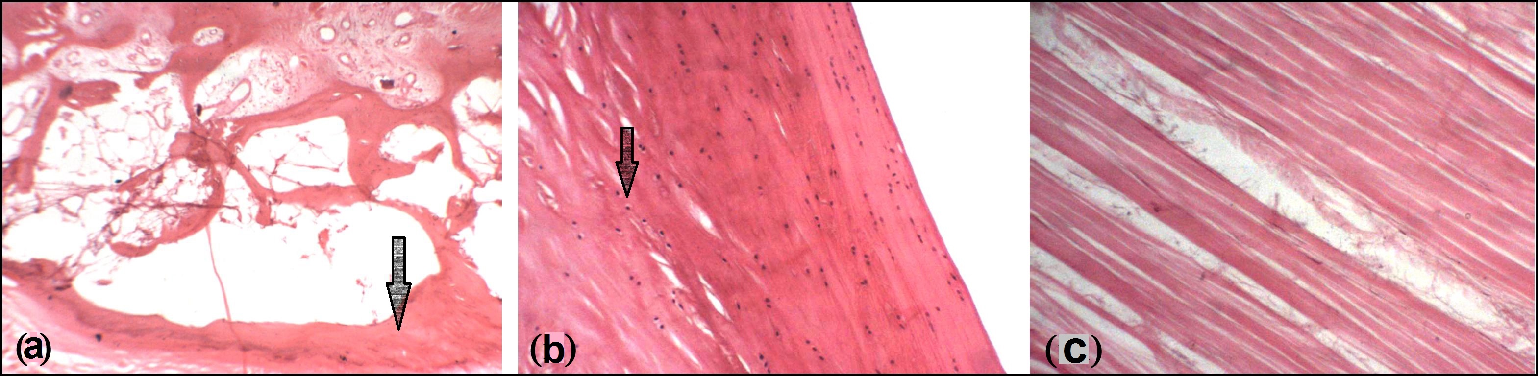 6]: Photomicrographs of OP showing (a) Cancellous bone (b) Fibrocartilage (c) Collagen fibres [H&E (10X)]