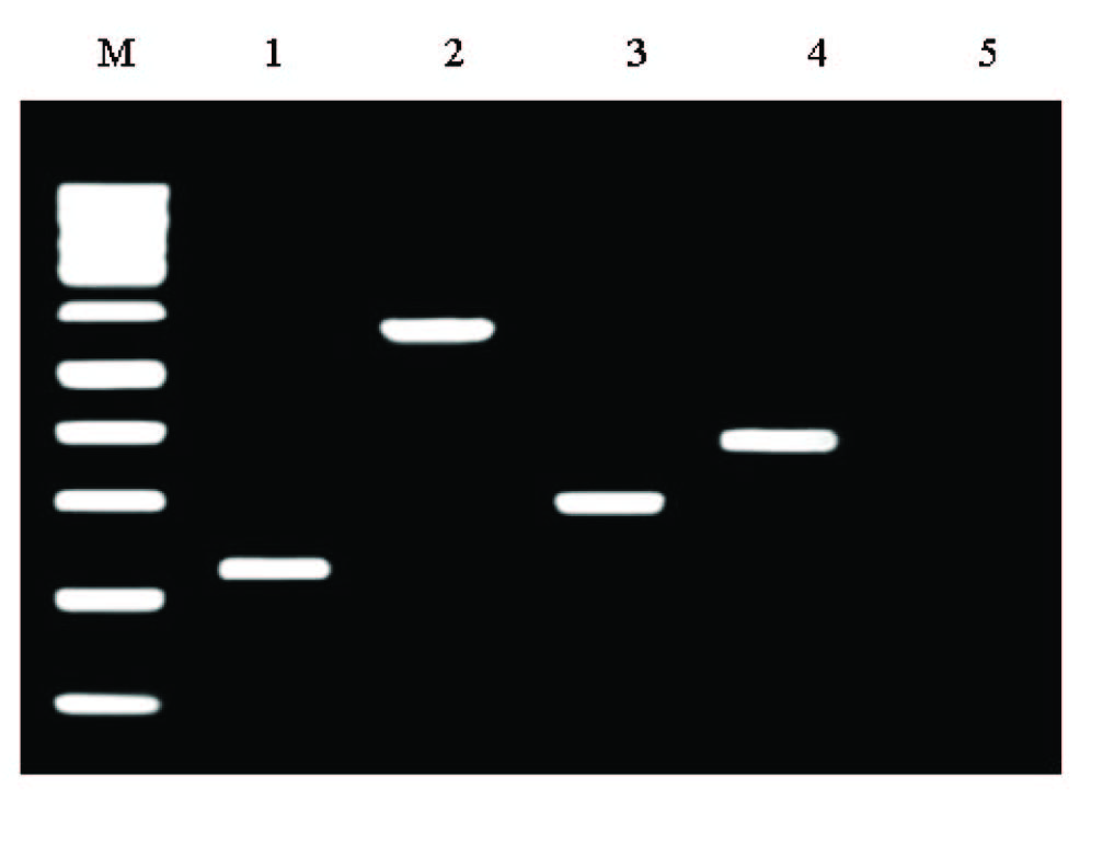 Line M: 100 bp DNA ladder (Fermentas, Germany), lines 1-5 represent 6B, 18C, 19F, and 23F serotypes of S. pneumoniae and negative control without DNA, respectively, in Gel electrophoresis of multiplex PCR for detection of serotypes of S. pneumoniae isolated from nasopharyngeal of patients