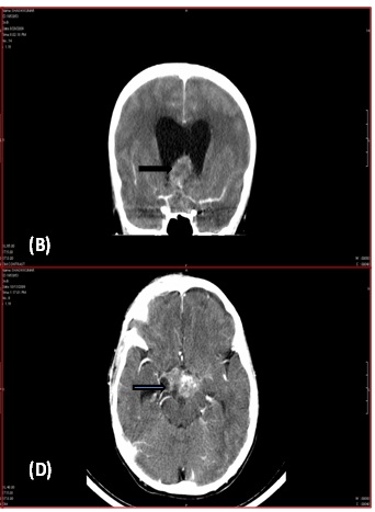 Three months later, the child presented with nocturnal urinary incontinence and difficulty in walking. CT scan [Table/Fig-1c&d] showed a lesion in suprasellar region with evidence of hydrocephalus. Histopathological examination of excised lesion showed tumour recurrence. Patient was advised Radiotherapy and further follow up.