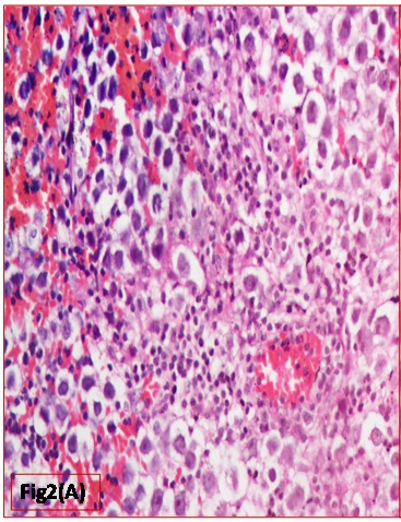 On Biochemical investigation; β-CEA: 1.2 ng/mL (Normal: <2.5 ng/mL), β-HCG: 340.4 mIU/mL (Normal: <5mIU/mL), αFP: 29.3 ng/mL (Normal: <10ng/mL) were found. Hence, it is seen that levels of tumour markers, i.e. β-HCG and αFP are significantly elevated, which aided in the diagnosis further.