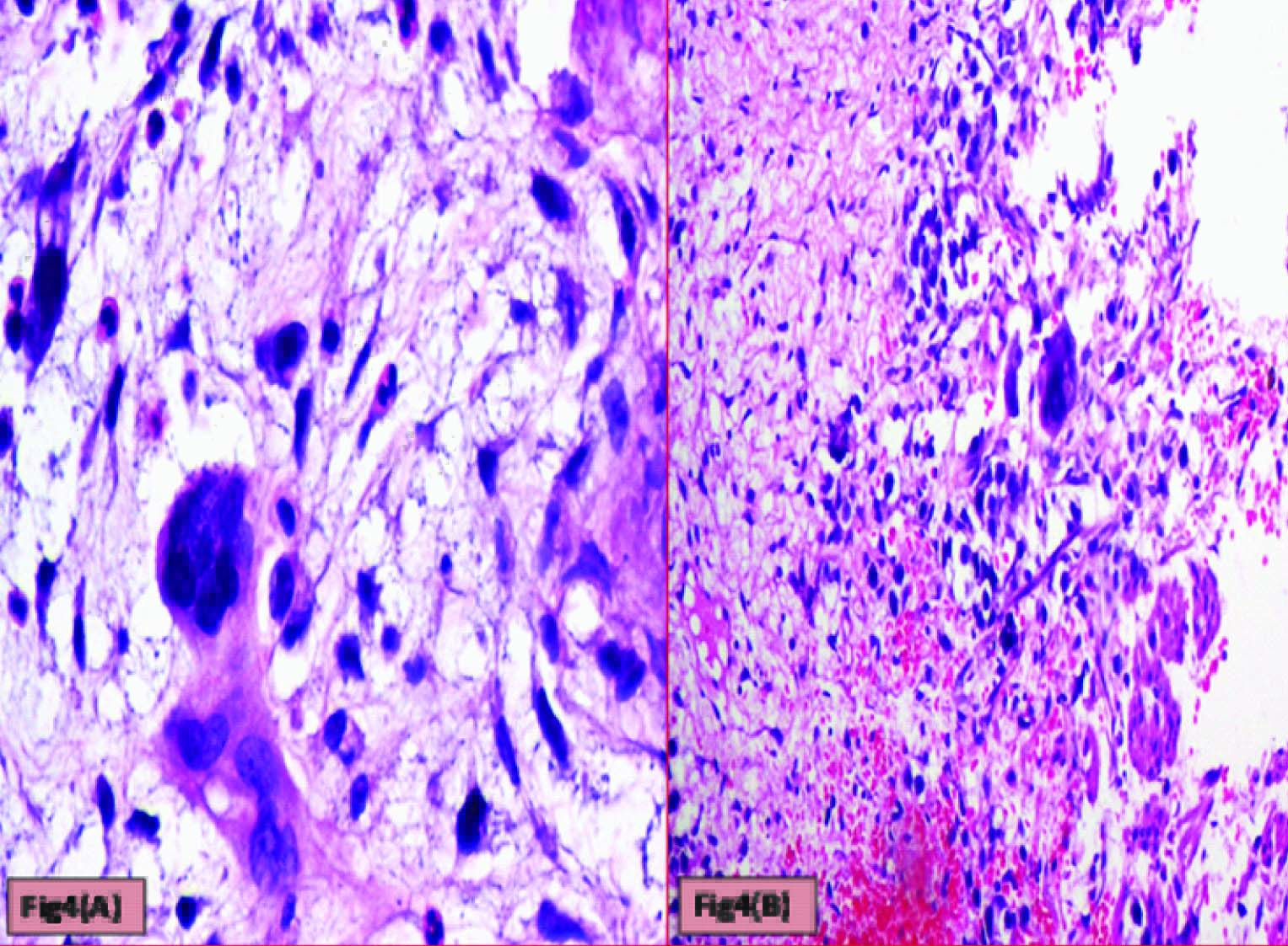 Cytotrophoblasts & Syncytiotrophoblasts with (a) Myxoid areas (H&E: 400X) (b) Hemorrhagic areas (H&E: 200X)