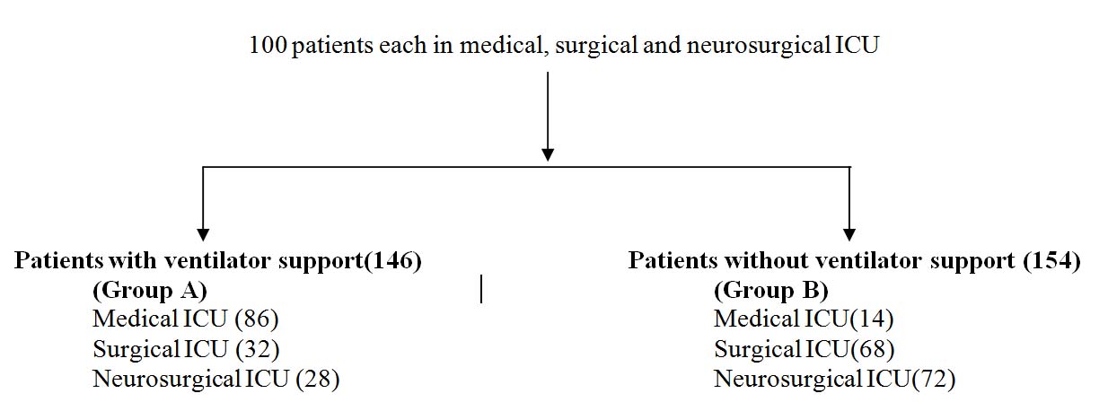 Total 300 patients (100 patients/ ICU) admitted in ICU were prescribed antimicrobial agents and were studied during for 23 month. All patients were followed up till their hospitalization in the ICU. Patients were divided in two groups [Table/Fig-1].