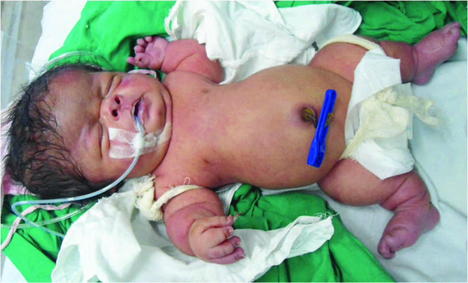 A 30-year-old, mother, delivered a 2.6 kg term female child by caesarean section, in view of brow presentation and failure of induction of labor. Antenatal ultrasound of mother at 5th and 7th month had detected a fetus with short curved limbs and small chest, with a suspicion of achondroplasia. At birth, the neonate was noted to have dysmorphic features, macrocephaly, midfacial hypoplasia, depressed nasal bridge, low set ears, short limbs, short narrow thorax with lumbar lordosis [Table/Fig-1,2] . Radiological survey of the child clinched the diagnosis of Thanatophoric Dysplasia (TD) Type I [Table/Fig-3]. Echocardiography screening revealed atrial septal defect, ventricular septal defect and patent ductus arteriosus with severe pulmonary hypertension.