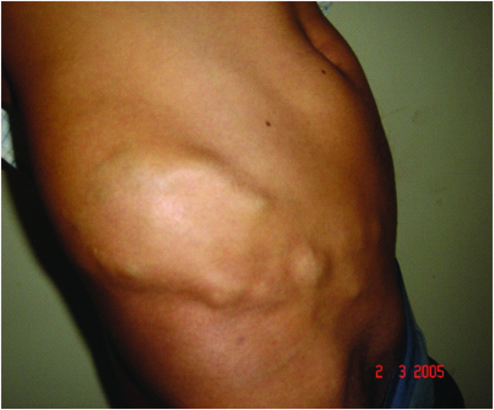 A 27-years-old male presented with a swelling around 10x8 cm on right side of lower abdomen mainly above iliac crest which was increasing in size involving right iliac and right lumbar region, swelling was soft, compressible, non pulsatile with indistinct borders, cough impulse was positive at inguinal region [Table/Fig-1].