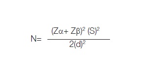 N=sample size; Zα=z value for alpha error; Zβ=z value for beta error; S=standard deviation; d=difference from mean value to be detected.