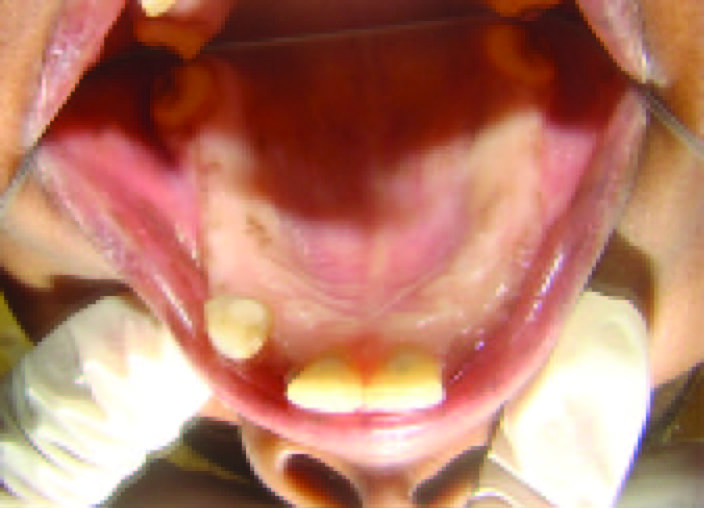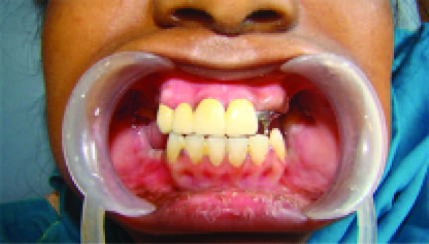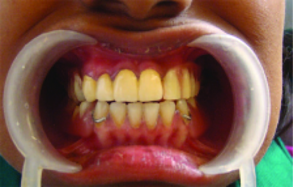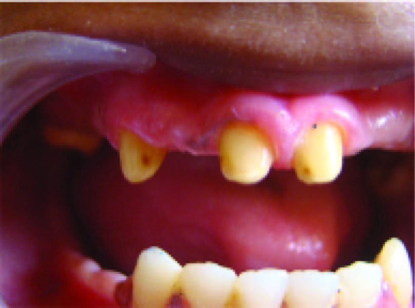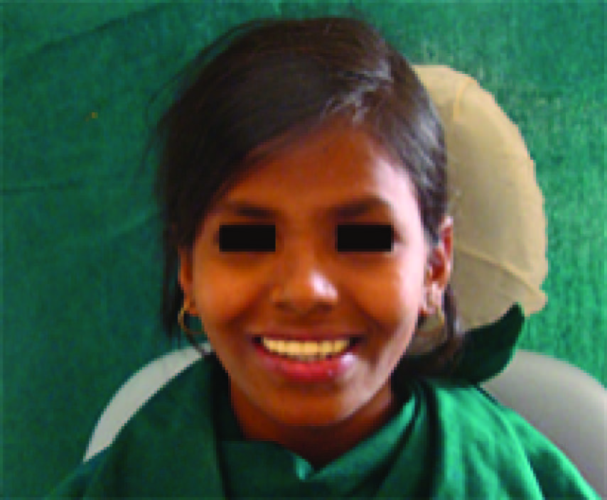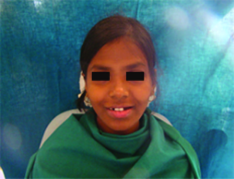 An 18-year-old girl reported with a chief complaint of missing teeth, poor oral hygiene and inability to eat. She desired aesthetic replacement of the missing teeth [Table/Fig-1]. Patient gave a history of early exfoliation of deciduous teeth due to caries and mobility. The permanent dentition erupted normally but there was gradual loss due to caries and mobility of some of the permanent teeth in both upper and lower arches of the jaws. On recording medical history it was noted that the patient suffered from chronic and severe vomiting, poor feeding, anorexia and constipation. Family history revealed parents, siblings and grandparents were healthy and did not show any signs of unusual tooth exfoliation.