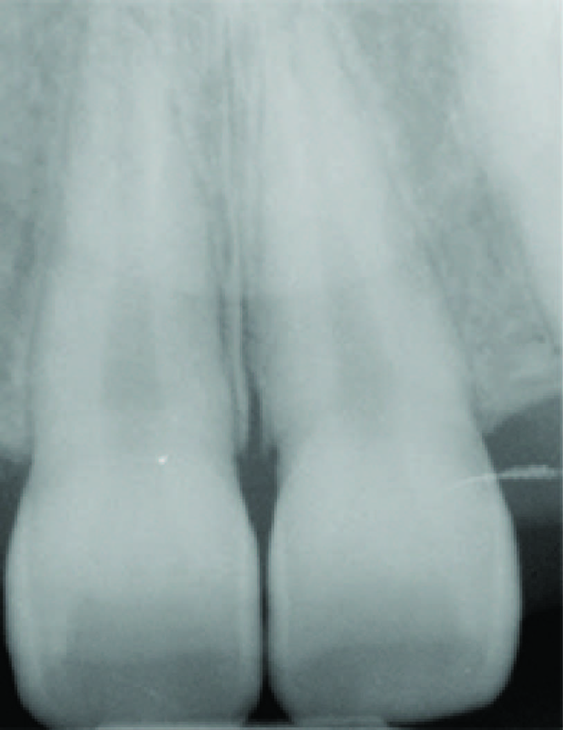 Intraoral periapical radiograph of maxillary central incisors showing enlarged pulp chambers