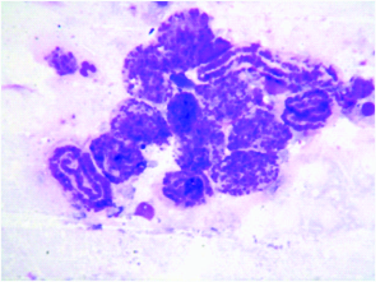 FNAC were done using 10 ml syringe and 22 gauge needle under aseptic precautions. Aspirated material was spread on slides. In case of cystic lesions, cyto-centrifugation of fluid was carried out and repeats FNAC from the residual swelling was also carried out. Air dried smears were stained with Giemsa stain. Out of all these cases of FNAC, there were incidental findings of microfilaria in 20 cases. All these slides were reviewed again to reaffirm the diagnosis of filariasis.