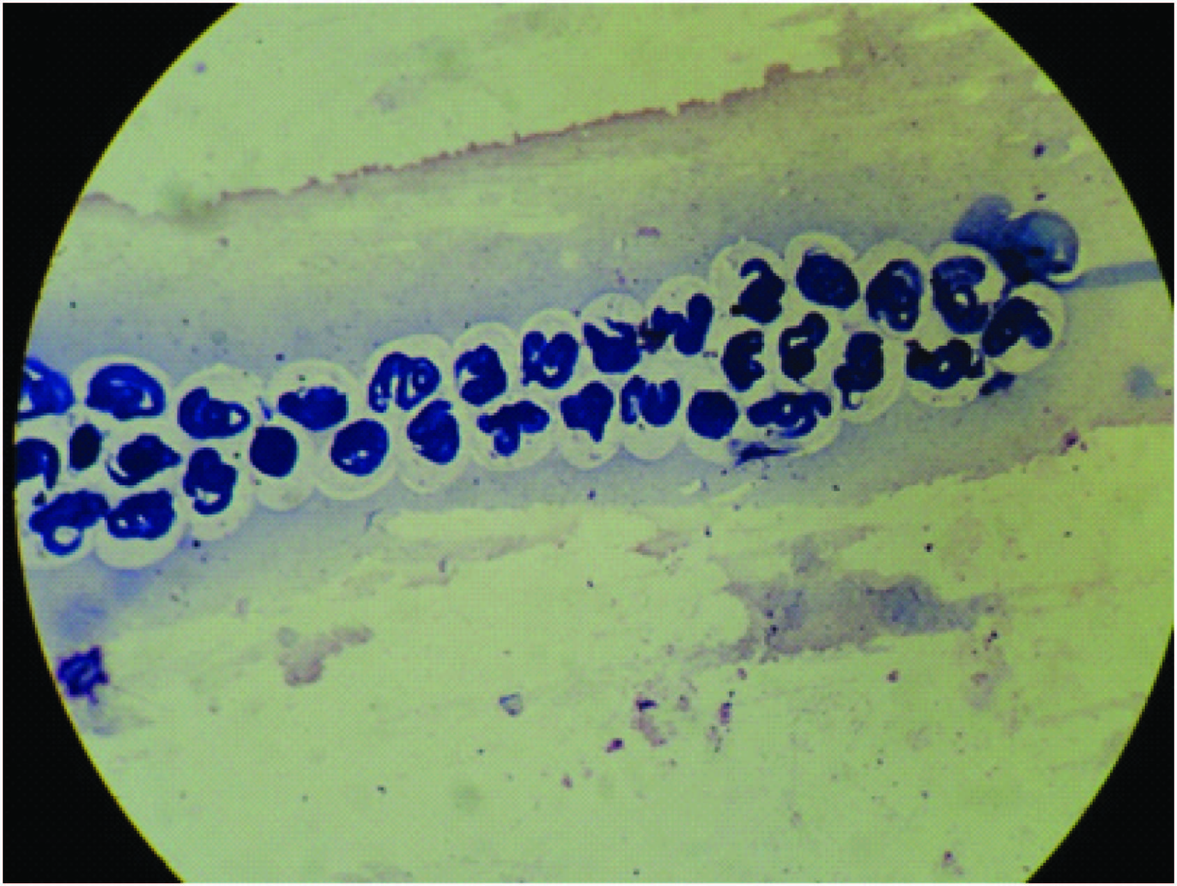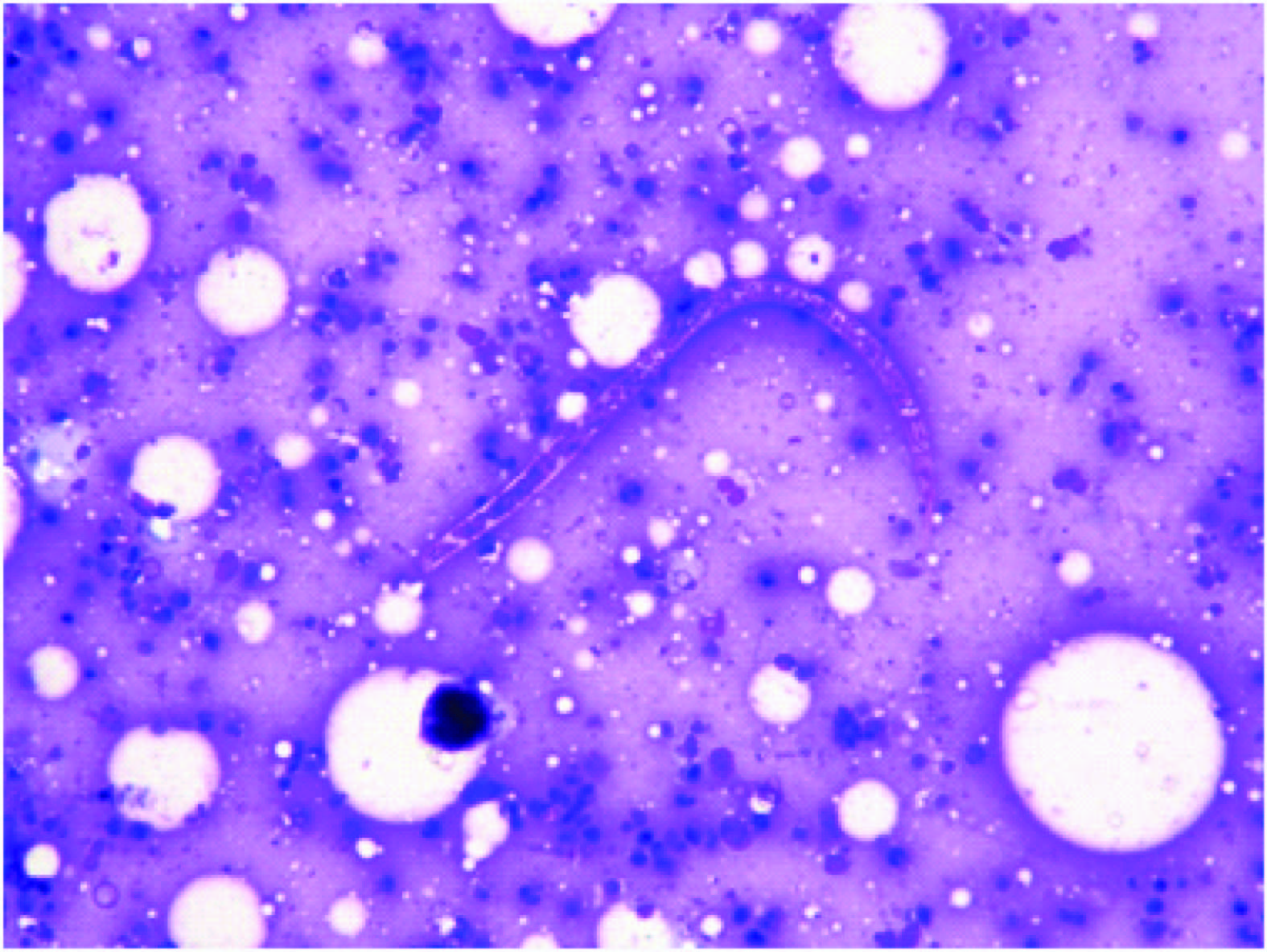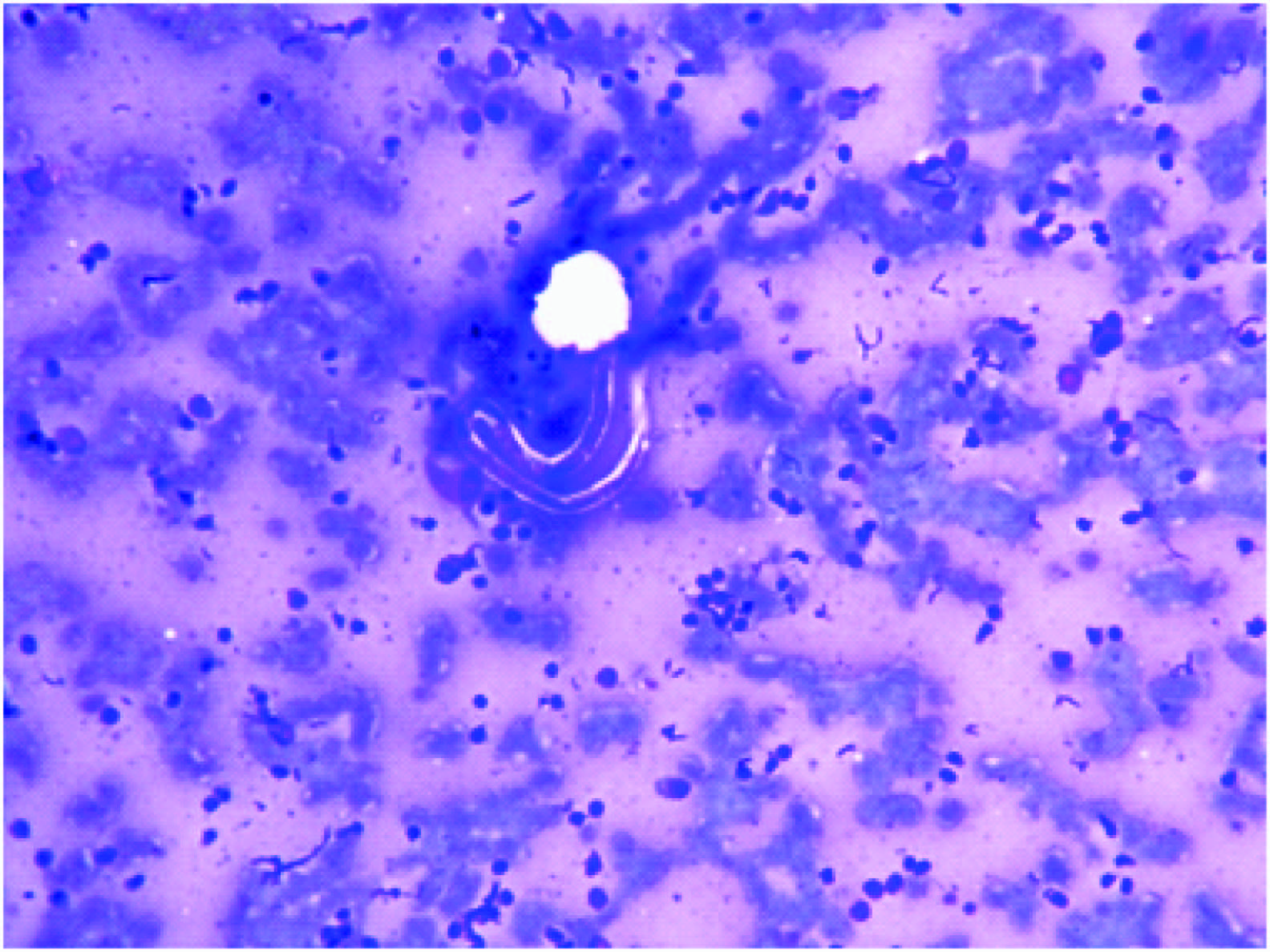 20x10X Aspirate from breast lump showing ensheathed microfilaria of W. bancrofti in the background of acute inflammatory cells