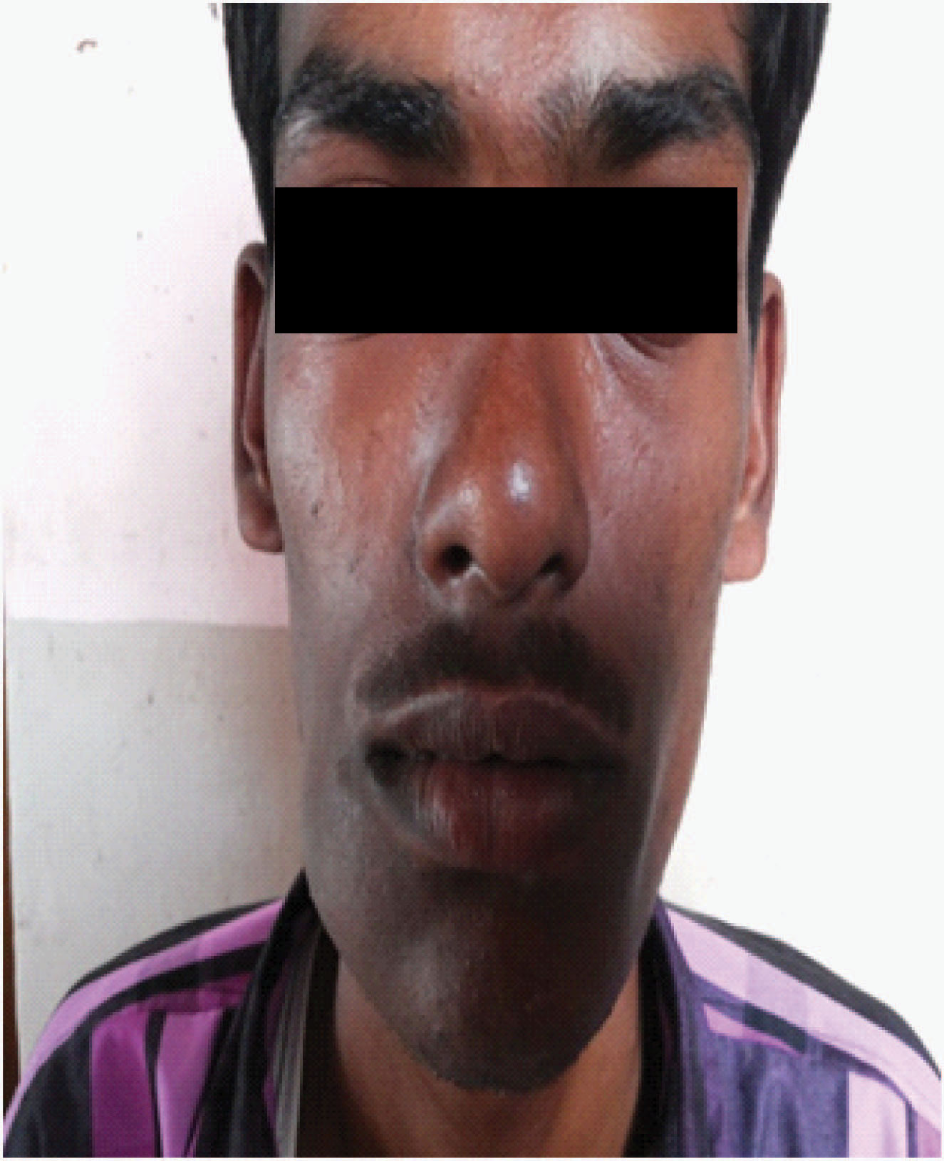 Clinical picture showing facial asymmetry, swelling in the right cheek