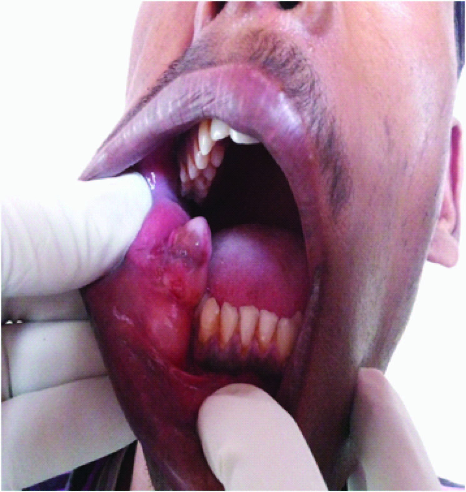 Intraoral Examination reveals a lobulated mass in right buccal mucosa,