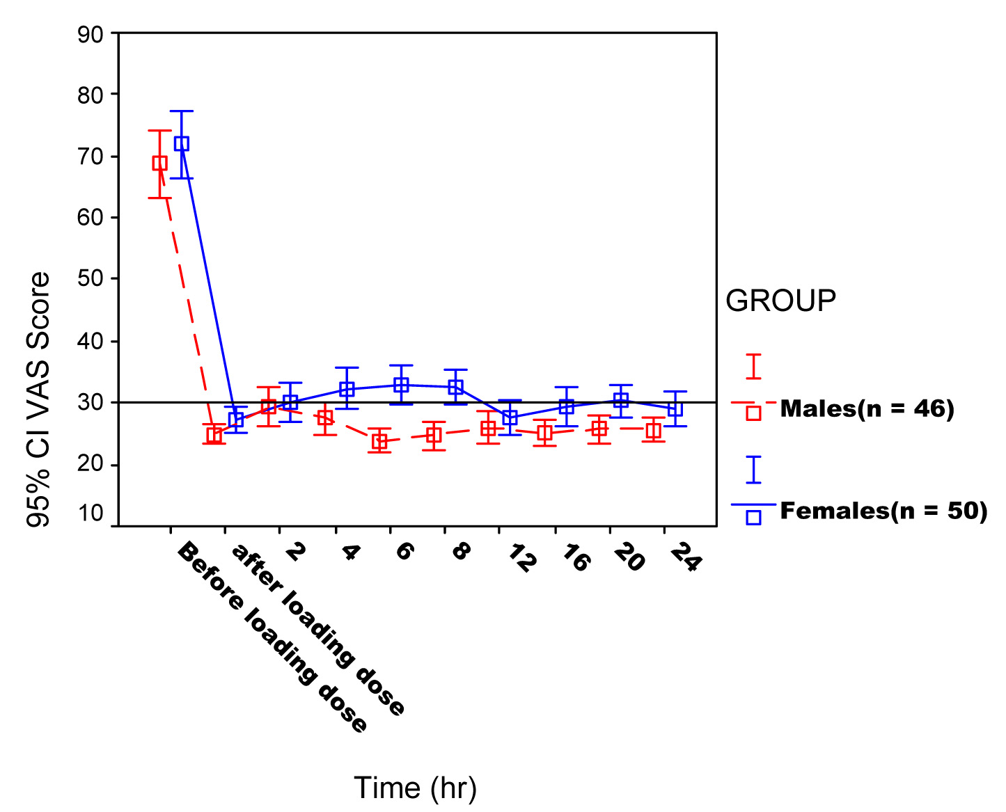 Several studies identified women reports more pain than men. We found the initial VAS score was significantly higher and the mean VAS score throughout the first postoperative period among females rated higher than males. But the vas scores were clinically acceptable in both groups. Numerous studies done on healthy subjects with experimental pain as well as clinical studies, supports our study. Women reported more pain when venipuncture pain was compared and it correlated with estrogen and progesterone levels positively [12]. Healthy volunteers, when injected hypertonic saline in the tibial muscle women reported more pain for long duration [13]. The increased pain sensitivity among females could be due to gonadal hormones, neurophysiologic differences among gender. Testosterone appears to provide better tolerance to pain. These differences are not only limited to the biological variations but the socio cultural factors could play a role. Generally women express pain without any inhibition contrary to the masculine gender as their gender role allows it [14]. So they reported more pain than men, though the consumption was lower than men.