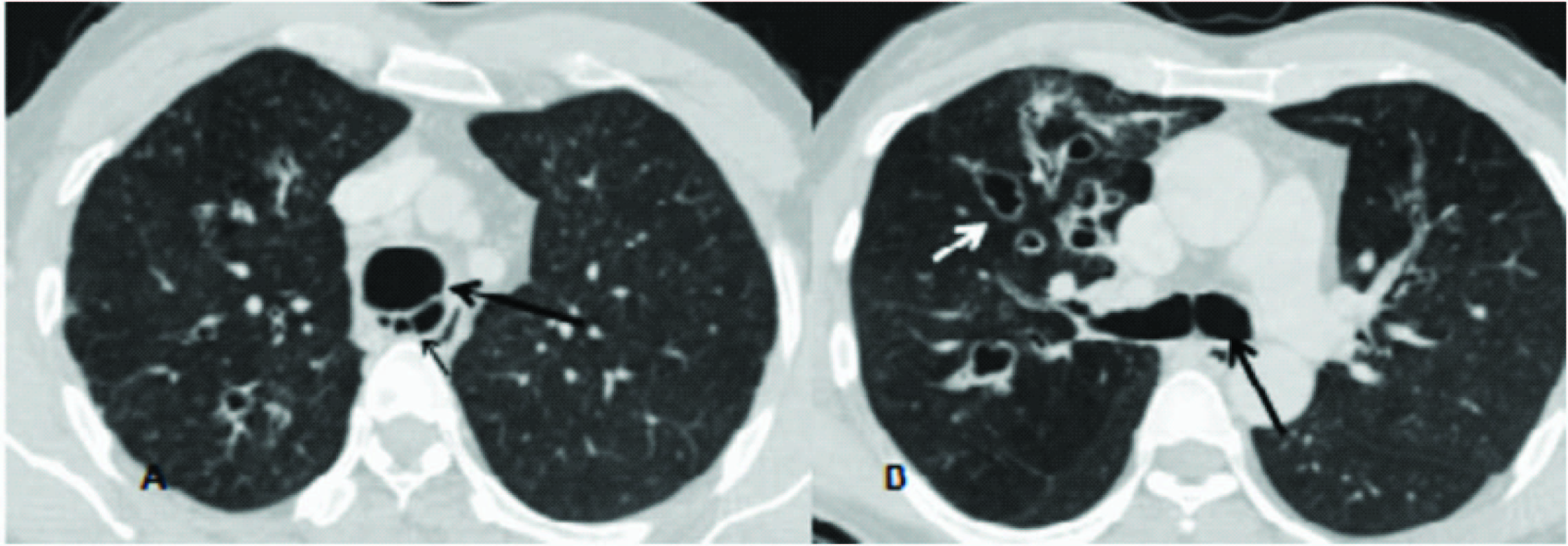 Axial CT chest sections –lung window (A,B) showing abnormal dilatation of tracheobronchial tree(large arrows) with small arrow in A showing tracheal wall diverticulae and small arrow in B showing cystic bronchiectasis,