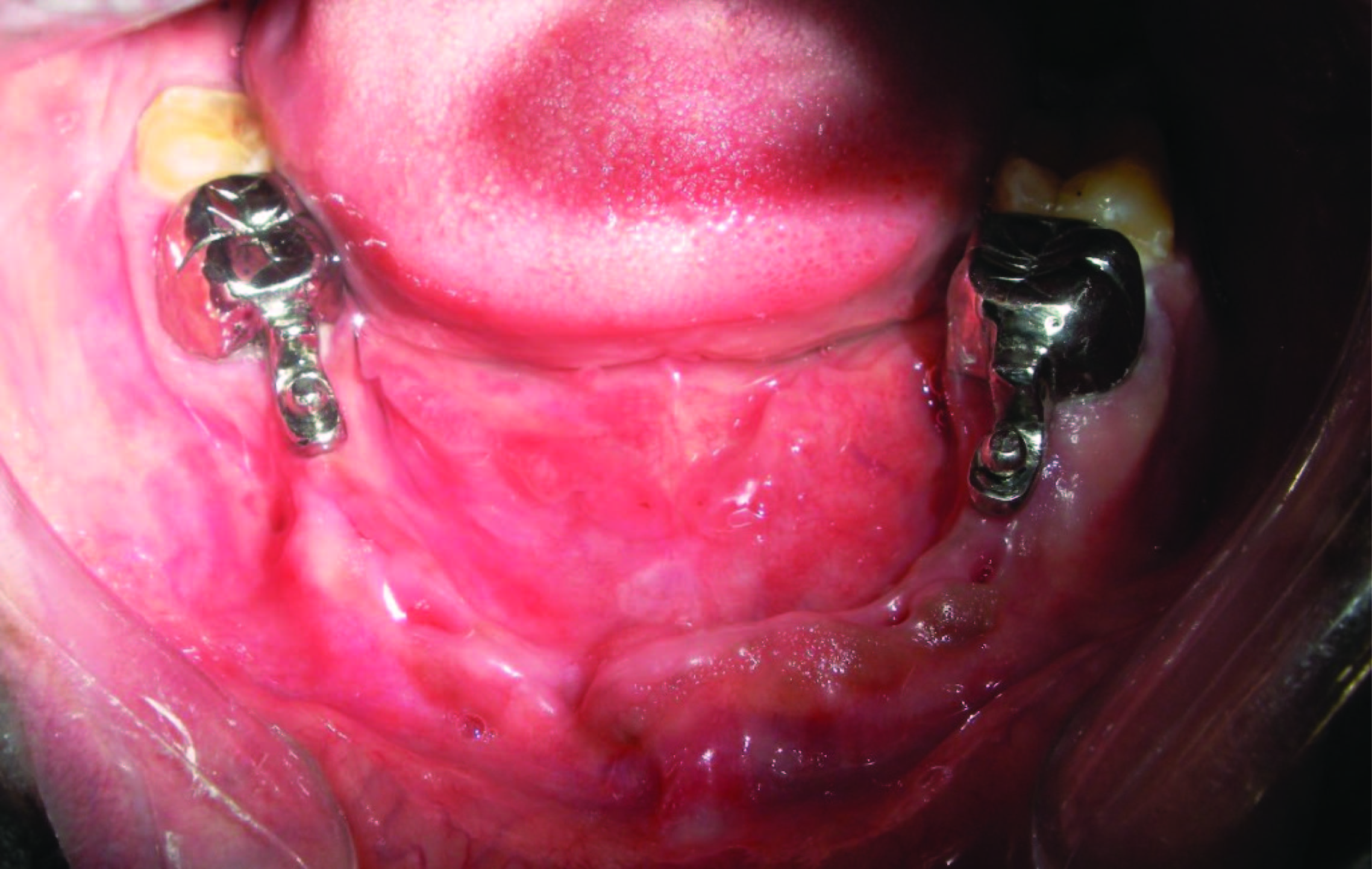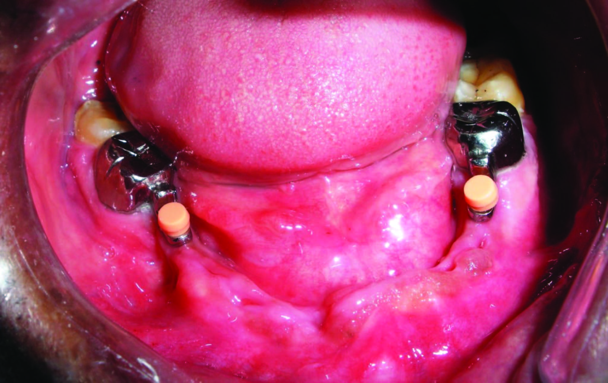 A 36-year-old male patient referred to Department of Prosthdontics. Bapuji dental college and hospital, Davangere, India, for opinion regarding rehabilitation of bilaterally missing mandibular anteriors and bicuspids. The reason for tooth loss was trauma. He gave a history of unsatisfactory acrylic partial denture. Patient had decreased lip support in anterior mandibular region. On intraoral examination, it was noted that the patient had fully dentate maxillary arch and missing 31,32,33,34,35, and 41,42,43,44,45,46 (Kennedy’s class IV) in mandibular arch. The remaining teeth in mandible arch were periodontally sound [Table/Fig-1]. Intra oral peri-apical radiographs in relation to 47, 48, 36, and 37 showed intact lamina dura, minimal bone loss and no peri apical pathology.