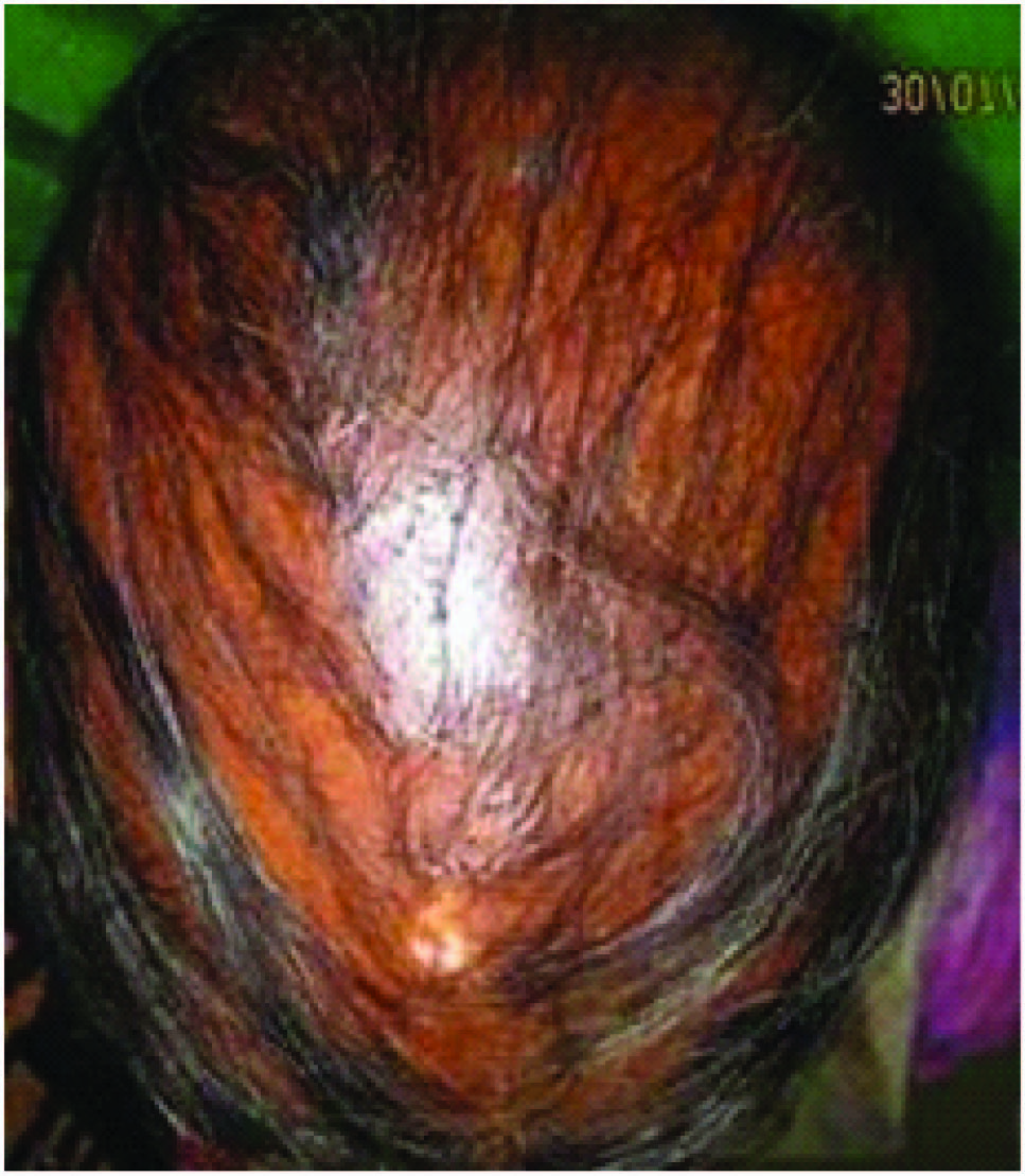 A 35-year-old female patient reported to the department with a chief complaint of burning sensation of the oral cavity since four months. The burning sensation was continuous and preceded by eruption of fluid filled blisters that used to burst with in few seconds. Her medical history was non contributory and on general examination multiple papules were seen on the face and scalp, which were associated with itching and loss of hair on the scalp. Black healed pigmented lesions of varying sizes were also evident on the face [Table/Fig-1&2]. On intraoral examination diffuse white linear striae with areas of erosions and pigmentation were seen on the right and left buccal mucosa [Table/Fig-3]. Fine linear striae and areas of erosions were seen on the right & left lateral borders of the tongue, with intact bullae seen on the left lateral and ventral aspect of the tongue [Table/Fig-4]. Based on the clinical findings, a provisional diagnosis of bullous lichen planus was considered with the differential diagnosis of pemphigus vulgaris and bullous pemphigoid. The patient’s haematological investigations, renal and liver function tests were within the normal limit. Following written informed consent, an incisional biopsy was performed and histopathological report was suggestive of lichen planus.The patient was evaluated and was advised betamethasone oral minipulse therapy comprising 5mg of betamethasone taken as a single daily dose orally for two consecutive days every week for three months, followed by tapering the dose from 5mg to 4 mg in the fourth month, 3mg in the fifth month, and 2mg in the sixth month.Treatment was stopped after six months and patient was followed up for the next three months.The visual analogue scale (VAS) score was recorded on every visit of the patient. Following the therapy there was remission of the lesions on the face, scalp, buccal mucosa and tongue [Table/Fig-5,6,7]. The patient is currently under follow up since 1½ year with no recurrence of the lesions.