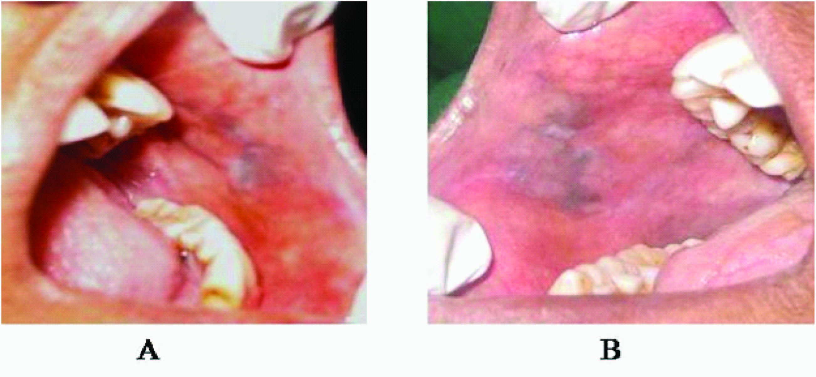 Post-treatment picture after 6-months. (A) complete remission of the lesion on the right buccal mucosa.(B) Complete remission of the lesion on the left buccal mucosa