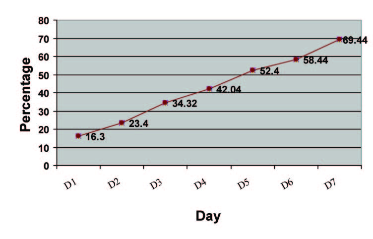 Drug release pattern of curcumin gel was studied in-vitro. The release of drug was performed in phosphate buffer of pH 7.2.The study revealed that about 16.30% (i.e. 0.815mg) of drug was released from curcumin gel at the end of 1st day and 69.44 % at the end of 7th day (ie.3.47mg) [Table/Fig-6].