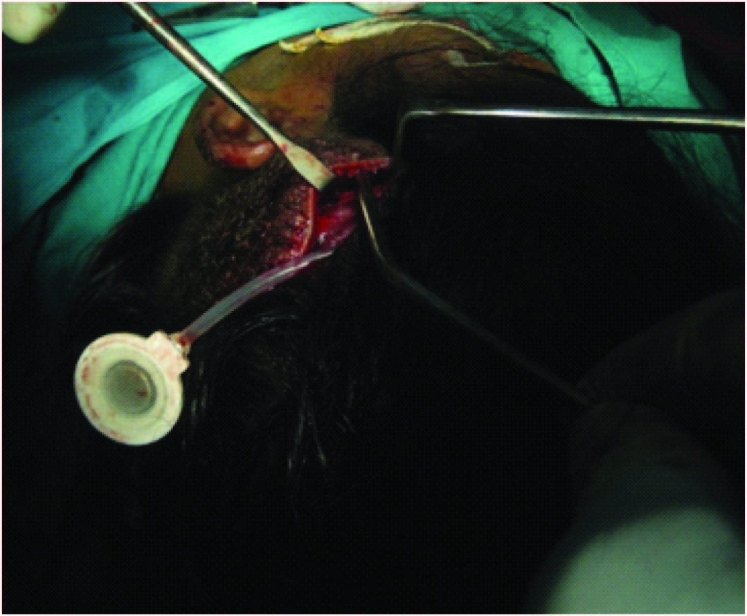 The plan was excision of the nevus with skin cover. The options were split skin graft, free tissue transfer and tissue expansion. The patient opted for tissue expansion as split skin graft would cause alopecia and there was no adequate hair-bearing scalp to use a free flap. Under general anaesthesia, an 5cm incision was made 1cm adjacent to the lesion on the parietal scalp and a subgaleal plane was developed. A 550ml rectangular silicon expander with remote port was inserted with the remote port placed in a subcutaneous plane in the pre-auricular region and the incision closed [Table/Fig-2,3] . Suture removal was done on 14th post-operative day and expansion was started on 21st day, about 80ml saline every week done for 1.5 months making a total expansion volume of 520ml. This was done as an outpatient procedure using aseptic precautions. A No.24 scalp vein set and a 20ml syringe was used to inject saline into the remote port [Table/Fig-4,5] .