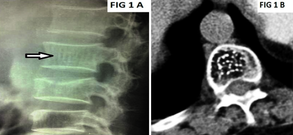 Conventional lateral radiograph of the lumbar spine [Table/Fig-1a] shows the classic corduroy cloth appearance (vertical striations) {white open arrow}, Axial CT of the lumbar spine [Table/Fig-1b] depicts polka dot appearance. Sagittal images of MRI spine T1WI [Table/Fig-2a], T2WI [Table/Fig-2b] and fat suppressed STIR images [Table/Fig-2c] show well defined oval lesions (white open arrow) involving lower thoracic and lumbar vertebrae appearing Hyperintense on T1WI and T2WI images and Hypointense on STIR images.