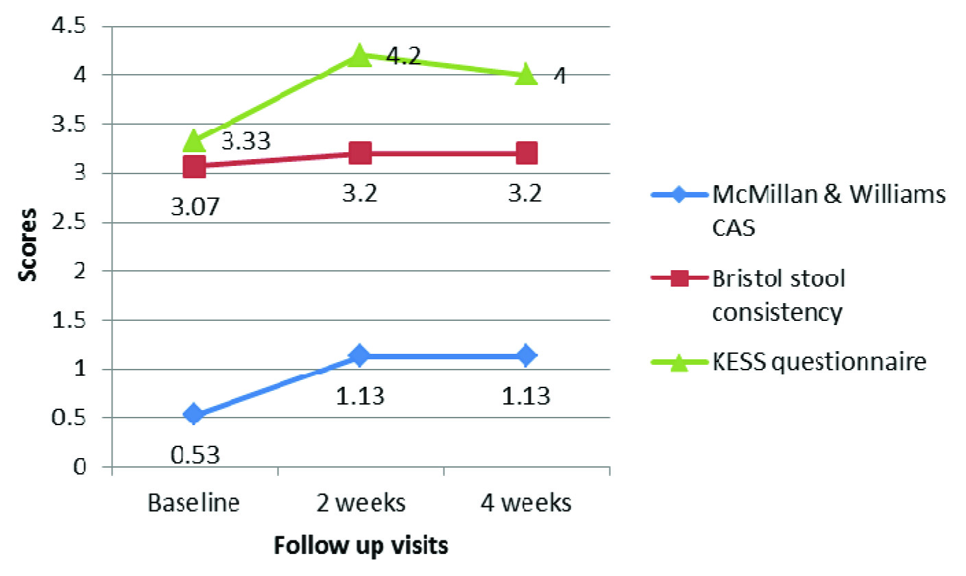 However, the difference was not significant between baseline and 4 week assessment (p = 0.566). The consistency of stool in patients with trospium too decreased slightly between baseline and follow up observations, though not statistically significant (p = 0.076). There was no significant difference in scores of KESS questionnaire between baseline, 2 weeks and 4 weeks, both within the group and between the groups (p > 0.05). A statistically significant increase in McMillan & Williams CAS was observed in both the groups between baseline and 2 weeks, and baseline and 4 weeks (p < 0.05), indicating troublesome defecation with the use of study medications. However, there was no significant difference between week 2 and week 4 McMillan & Williams CAS (p > 0.05) [Table/Fig-4,5,6]. Also, the difference in CAS between the two groups was not statistically significant either at week 2 or week 4 of treatment (p = 0.778 and p = 0.944 respectively). All the patients showed good compliance to the study medications (as assessed using pill count method).
