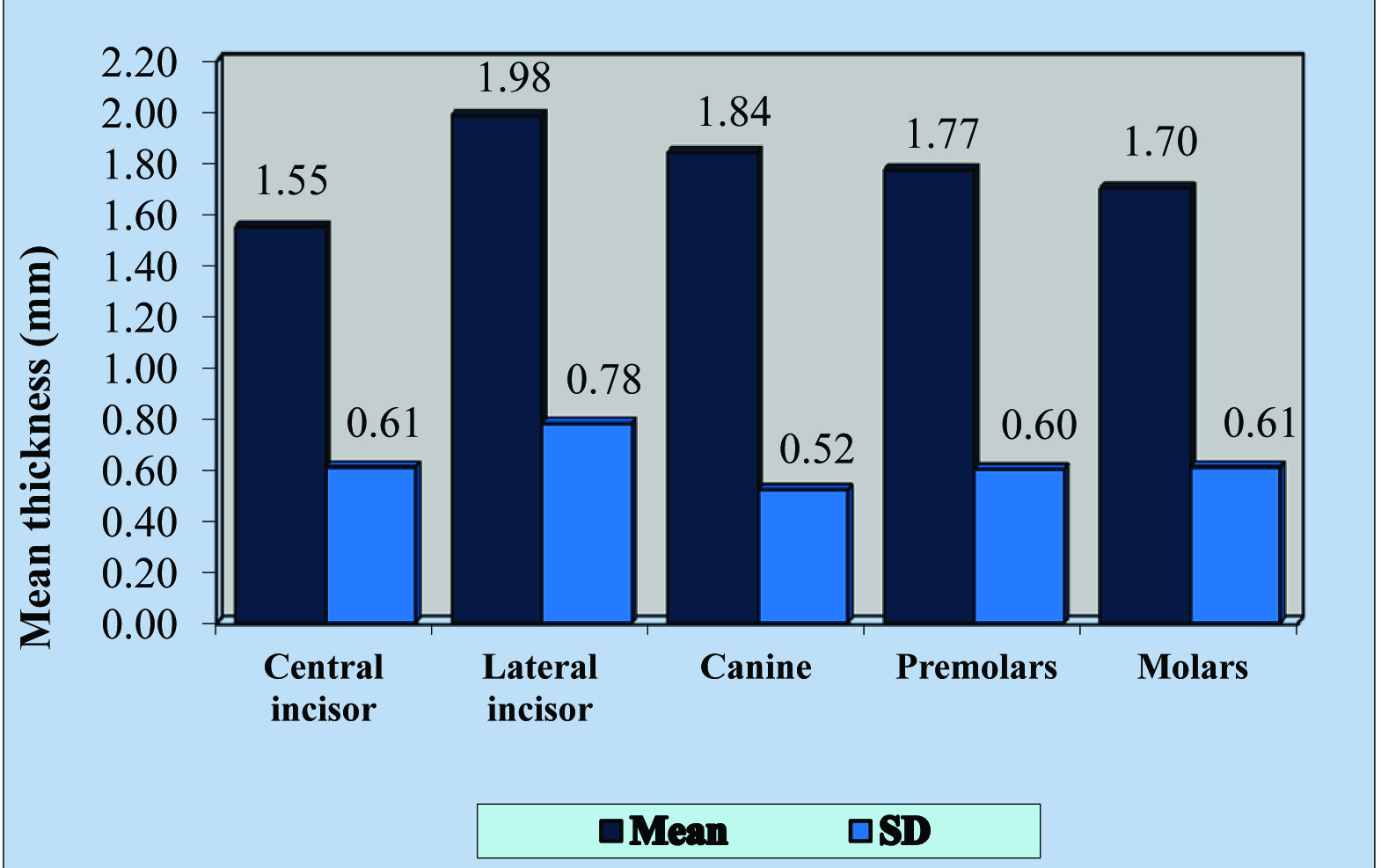 | Central incisor | 50 | 1.55 mm±0.61 mm | 0.09 | 39.22 |