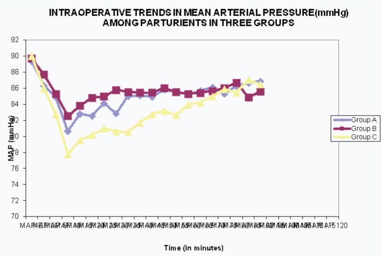 Lowest MAP was seen at 10 minutes in all the three Groups, which was 80.66±10.58, 82.55±6.09 and 77.77±7.57 mmHg in Groups A, B and C respectively. Thus, lowest MAP was seen in Group C and the difference was statistically significant as compared to Groups A and B. Minimal MAP in Groups A and B were statistically similar [Table/Fig-3,4].