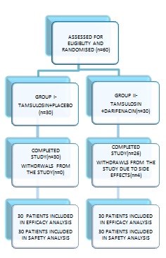 From November 2012 to February 2014, 60 patients of BPH with accompanying OAB symptoms were screened in the out-patient clinic of University College of Medical Sciences (University of Delhi, India) & GTB Hospital, Delhi. After protocol approval by the Institutional Ethics Committee and after obtaining a written informed consent, all eligible patients satisfying the entry criteria, they were enrolled in to the present study. This study has been registered with the “Clinical trials registry of India, CTRI/2014/08/004811”. Entry criteria included, symptomatic patients of BPH (determined by LUTS and supplemented by IPSS/focused urological examination/investigations) associated with any one or more of the following overactive bladder symptoms like; urinary frequency/24 hour(day and night) >8 per 24 hour, nocturnal frequency > 2 per 24 hour, urgency episodes > 1 per 24 hour with or without urge incontinence. Patients of BPH with Qmax <5 ml/s, voided volume <50 ml/s, ultrasound proven PVR >150 ml/s and or progressively rising PVR, renal failure, untreated UTI and vesical stones, patients with the contraindications of α1-adrenergic receptor antagonist or antimuscarinic agent were excluded from this study.