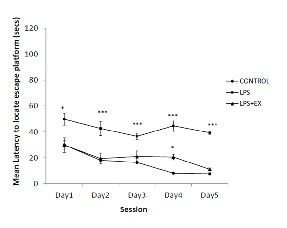 Overall escape latency analysis: The overall escape latencies were significant between groups during day1 to 5 of training sessions in MWM (day 1, ANOVA F (2, 17) = 6.060, p <0.05; day 2, ANOVA F (2, 17) = 11.520, p <0.001; day 3, ANOVA F (2, 17) = , p <0.001; day 4, ANOVA F (2, 17) = , p <0.001; day 5, ANOVA F (2, 17) =, p <0.001) [Table/Fig-1]. Post-hoc test revealed there were no significant differences between control and LPS+Ex groups observed during days 1, 2, 3 and 5 of the training period. However, on the day 4 of training, the LPS+Ex group had significant longer latency than the control group (p<0.05).