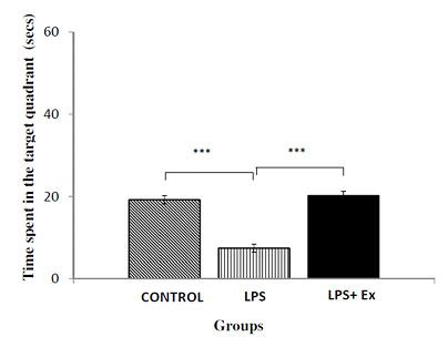 Significant main effect of running exercise were present during the five days training period of MWM test, in which rats of LPS+Ex group showed significant decrease in latency to reach the escape platform, i.e. lesser duration to reach the platform, compared to the LPS group [Table/Fig-1]. However, except day 4 of training period, there were no significant difference noted between control and LPS+Ex group in the training days. In the memory retention test, with removal of platform, in comparison with the rats of LPS group, the LPS+Ex group rats remembered the location of platform and spent significant longer duration in the target quadrant in search of escape platform (Post-hoc, p<0.001). Conversely, between control and LPS+Ex group there was no significant difference observed in the memory retention test [Table/Fig-2].