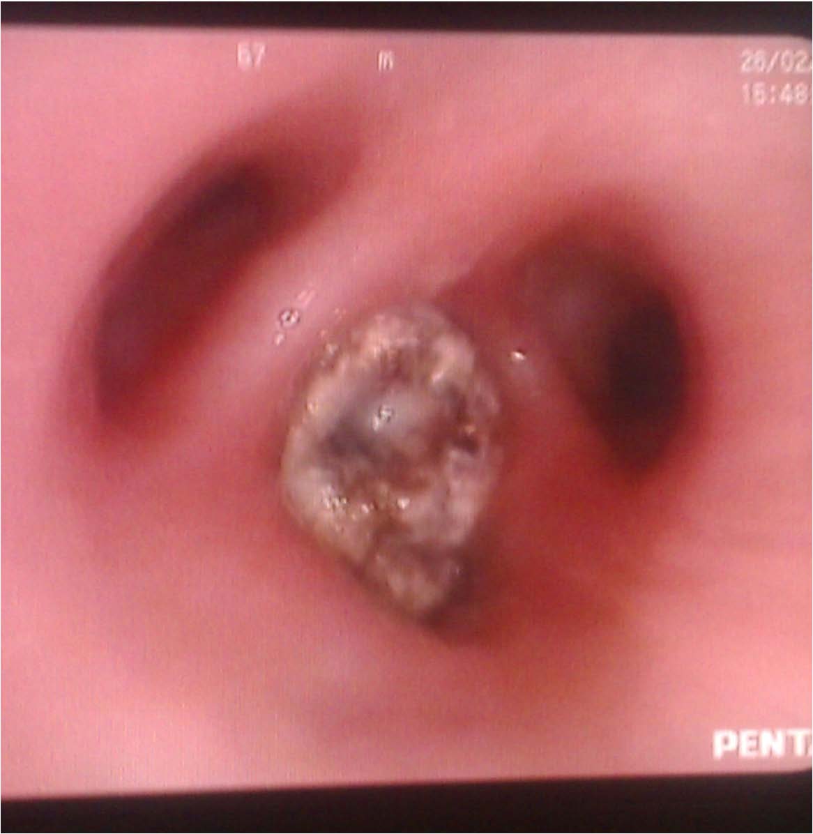 Bronchoscopic picture of a betel nut in the right superior segment bronchus (B6) covered with mucopus