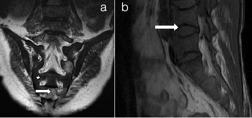 Persistent red marrow a) Sacrum b) Spine (a) Coronal T2WI of sacrum and (b) Sagittal T1WI of Spine shows low signal intensity marrow (white star) compared to adjacent muscles suggestive of cellular (red) marrow. There are multiple bony infarcts in S2, S4 and S5 vertebrae (small arrow). There are vertebral end plate concavities at multiple levels due to end plate infarction giving fish mouth appearance