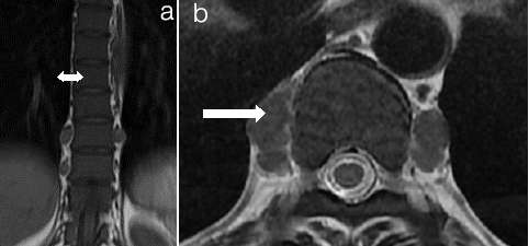 Extramedullary haematopoiesis (a) T1Weighted Image (b) T2Weighted Image (a) Coronal and; (b) Axial MRI Images of Thoracolumbar spine. Extramedullary Haematopoiesis is seen as lobulated paravertebral soft tissue masses (arrow in b) with intermediate signal intensity on T1 and T2 weighted images similar to signal intensity of normal intrameduallary haematopoietic tissue. Also there is Persistent red marrow in vertebral bodies (double head arrow in a)
