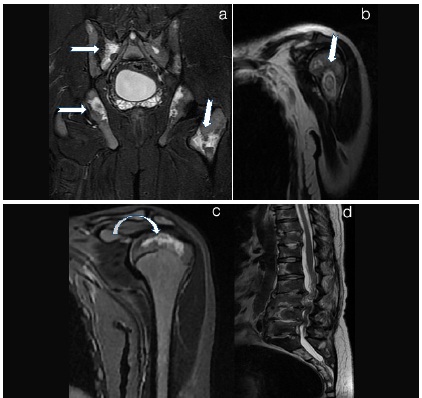 Bony infarcts at multiple sites a) Pelvis STIR b) Left Humeral neck T2WI c) Left Humerus epiphyseal infarct T2WI d) T2 Weighted Image a) Cor STIR of Pelvis shows multiple areas of hyperintense signal in iliac bones, sacrum and left femur neck suggesting infarcts (arrows in a). b) and c) Cor T2WI Head and neck of left humerus shows altered signal intensity areas with a hypointense rim suggesting infarcts (arrow in b, curved arrow in c) . d) T2WI of the vertebral column shows multiple vertebral bone marrow infarcts with infective pre and paravertebral collection