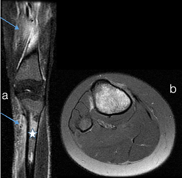 Bone marrow and soft tissue oedema a) Tibia and Femur Coronal b) Axial Tibia a) STIR image Extensive bone marrow oedema (star in b) in tibia with surrounding soft tissue hyperintensity (arrows in b) suggesting soft tissue oedema. b) Axial STIR tibia shows increased signal in medulla of tibia and surrounding soft tissues suggesting marrow oedema