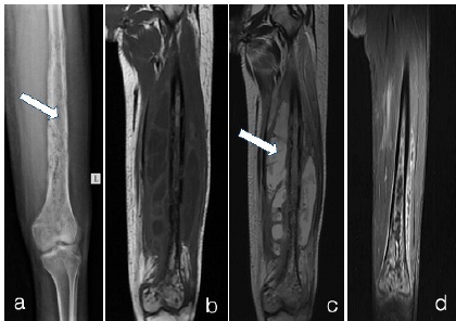 b) and c) MRI T1WI Coronal show multiple cortical irregularities and erosions with medullary hyperintense signal in shaft and distal femur. There are multiple collections in surrounding soft tissues which appear hypointense on T1 and hyperintense on T2. (arrow in c). d) Contrast enhanced T1 fat sat image - shows enhancement in medulla and surrounding soft tissues