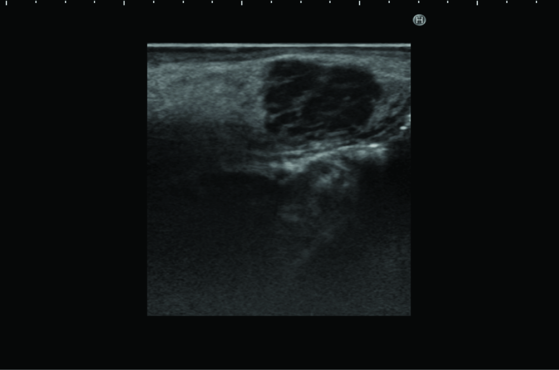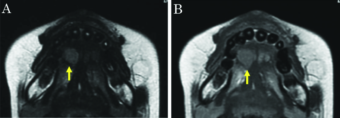 Ultrasonography revealed a rounded mass in the right side of the tongue, with irregular, unsharp borders. Ultrasonography demonstrated a predominantly hypoechoic appearance, with some hyperechoic foci [Table/Fig-2]. Magnetic resonance imaging (MRI) demonstrated a mass in the right side of the tongue, with slightly elevated signal intensity on T2-weighted imaging, and weak enhancement on gadolinium-enhanced T1-weighted imaging [Table/Fig-3a,b]. Laboratory analyses showed: white cell count, 3,000/μl; lactate dehydrogenase, 188 U/l; serum alpha-fetoprotein (AFP), 182 ng/ml; serum IgG, 480 mg/dl; serum IgM, 571 mg/dl; and serum IgA, 4 mg/dl. The tumour was initially diagnosed clinically as salivary gland tumour, such as pleomorphic adenoma. However, we considered that the tumour might represent malignant lymphoma, because the patient had already been diagnosed with AT.