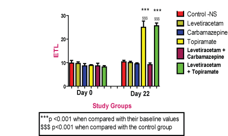 When the extended transfer latency (ETL) of study animals was evaluated using Morris water maze, baseline values of all the study groups were comparable to each other. After 21 day drug treatment, significant increase in the ETL was observed in groups treated with Topiramate (p=0.0001) and combination of Levetiracetam + Topiramate (p<0.0001) from their baseline values. Similar results of increase in ETL were also noted in the same group animals (Group IV & VI) when compared with the control group treated with normal saline (p=0.0003 and p<0.0001 respectively). In the other treatment groups (Levetiracetam, Carbamazepine and Levetiracetam + Carbamazepine), there was no statistically significant difference between the ETL from its baseline to reading on the 22nd day [Table/Fig-1].